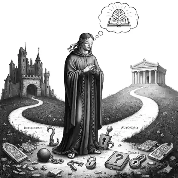 Para Immanuel Kant, o esclarecimento é a saída do ser humano da sua menoridade, da qual ele próprio é culpado. A menoridade é a incapacidade de fazer uso do seu entendimento sem a direção de outro. Em termos simples: é quando deixamos que outros (um livro, um guia espiritual, um político ou um algoritmo) pensem e decidam por nós. Kant afirma que não nos falta inteligência, mas sim coragem e determinação para agir de forma autônoma.