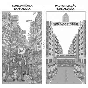 A primeira representa a diversidade do mercado capitalista; a segunda, o foco socialista na utilidade e na eliminação do desperdício de marketing.