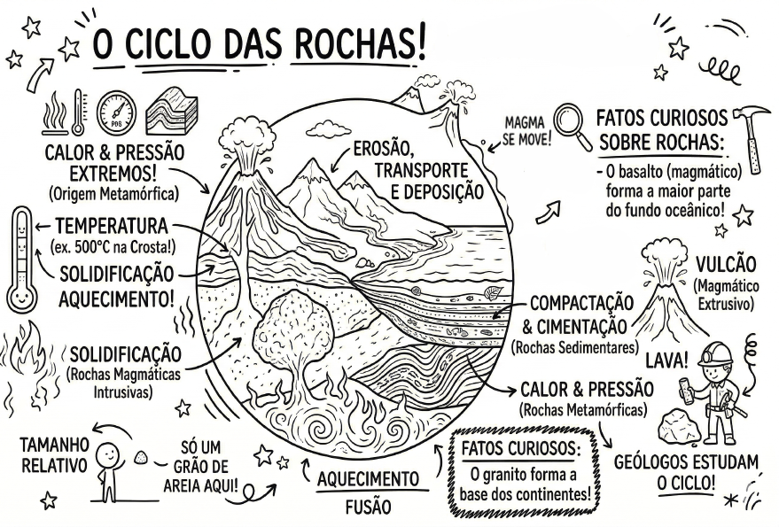 • Utilizar a atividade visual (Doodle) para traçar as setas do ciclo, ilustrando como o magma se torna rocha ígnea, que pode virar sedimento, compactar-se em rocha sedimentar e, eventualmente, sofrer metamorfismo ou derreter novamente.