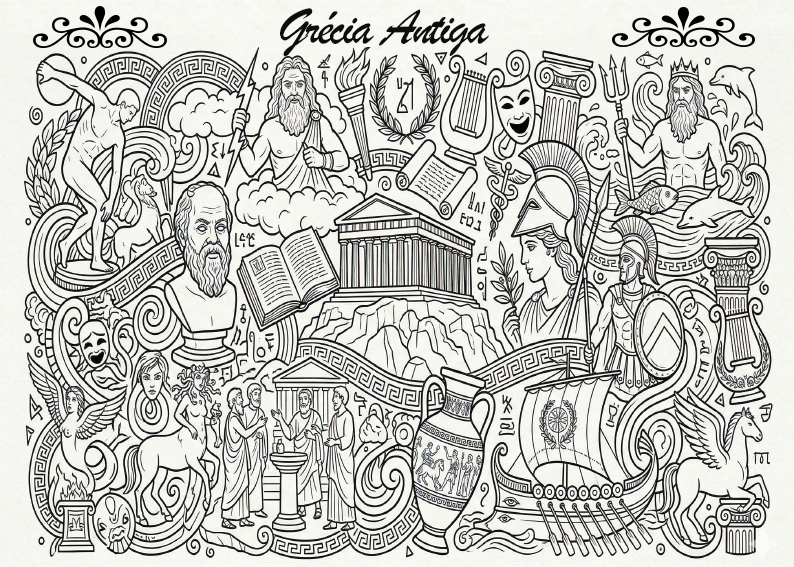 Leve seus alunos em uma jornada pelo berço da civilização ocidental com nossa atividade de colorir sobre a Grécia Antiga. Desenvolvido para facilitar o ensino de História no Ensino Fundamental e Médio, este material interativo transforma conceitos clássicos em uma experiência visual atrativa e de fácil assimilação. Ao preencher e colorir este resumo, o estudante consegue organizar mentalmente a estrutura das pólis (cidades-estado), as diferenças fundamentais entre o militarismo de Esparta e a democracia de Atenas, além de explorar a riqueza da mitologia, da filosofia e dos Jogos Olímpicos. É o recurso ideal para dar vida à Antiguidade Clássica.