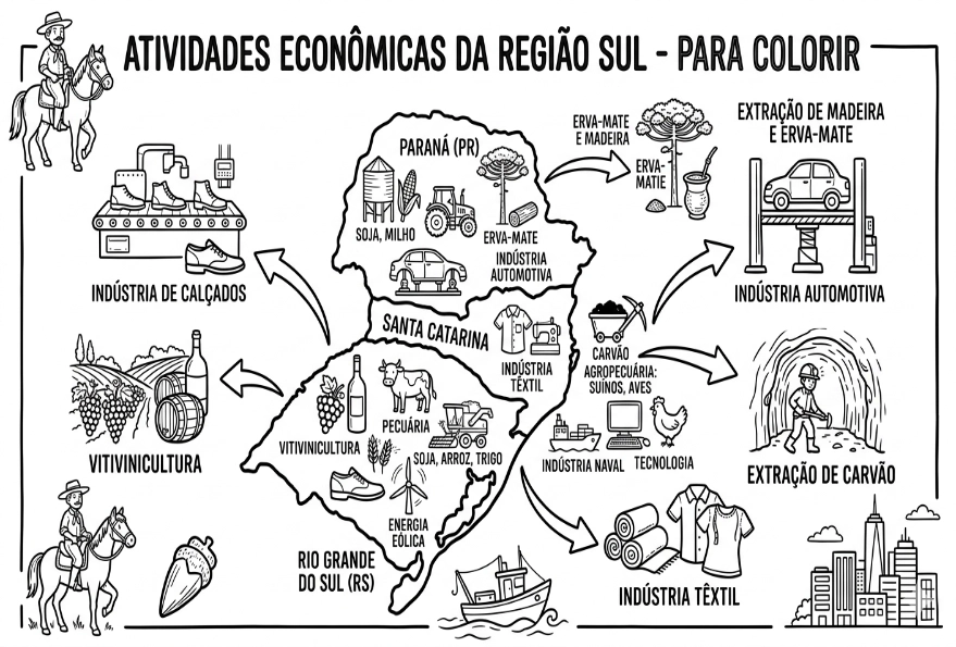 Conheça as principais atividades econômicas da Região Sul com esta atividade pedagógica para colorir. Atividade focada em agroindústria, cooperativismo, polos têxteis e energia para aulas de Geografia.