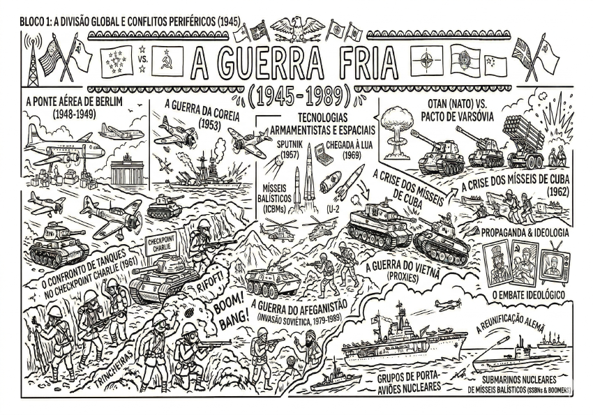 • Utilizar o Doodle visual para esquematizar os principais marcos tecnológicos e conflitos locais que definiram a disputa hegemônica global, consolidando o aprendizado antes da avaliação.