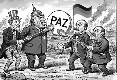 Observe a charge mostrando a Alemanha sendo obrigada a engolir uma pílula escrita "Paz" pelos líderes aliados: