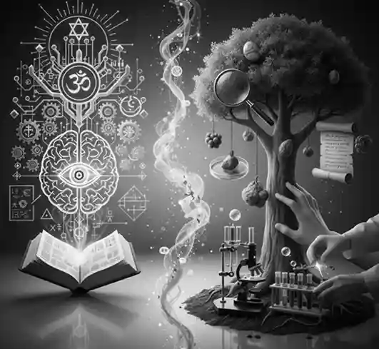 Essa divisão simboliza as diferentes fontes de conhecimento humano: a fé e a intuição contra a razão e a evidência material.