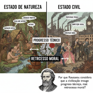 Observe a imagem que ilustra o "Estado de Natureza" vs. "Estado Civil". Por que Rousseau considera que a civilização trouxe progresso técnico, mas retrocesso moral?