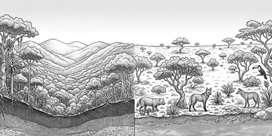 Entre os grandes domínios existem as Faixas de Transição, como o Pantanal e o Agreste, que misturam características de vizinhos diferentes. Ao sul, encontramos o Domínio das Araucárias, marcado por planaltos e clima subtropical, e o Domínio das Pradarias (Coxilhas), com relevo suave e gramíneas. No semiárido, o Domínio da Caatinga apresenta depressões intermontanas e solos pedregosos. Compreender esses domínios é entender como o relevo brasileiro "conversa" com o clima para criar as condições de vida e produção econômica em cada região e garantir a sustentabilidade dos ecossistemas locais brasileiros.