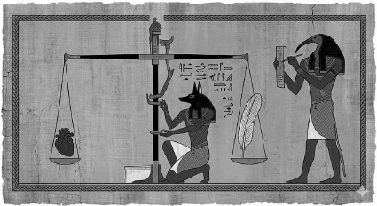 A divindade é Anúbis. Ele avalia se o coração do morto é mais leve que a Pena da Verdade (Maat), o que comprovaria uma vida justa e digna da eternidade.