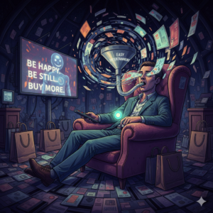 A imagem critica o lazer passivo. Para os autores, o tempo livre não é usado para o desenvolvimento pessoal ou crítica social, mas sim como uma extensão do mercado de consumo, onde o indivíduo é "alimentado" com entretenimento fácil que mantém o status quo.