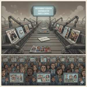 Os filósofos alemães Theodor Adorno e Max Horkheimer, expoentes da Escola de Frankfurt, criaram o termo "Indústria Cultural" para descrever como a arte e a cultura passaram a ser produzidas seguindo a lógica das fábricas. Em vez de a arte ser uma forma de expressão livre ou crítica, ela se torna um produto feito para ser vendido em massa. A música, o cinema e a televisão passam a utilizar "fórmulas de sucesso" repetitivas para garantir o lucro, transformando o público em meros consumidores passivos.