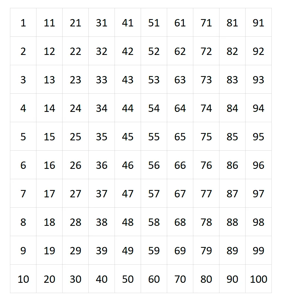 Tabela dos numerais do 1 ao 100 para imprimir.