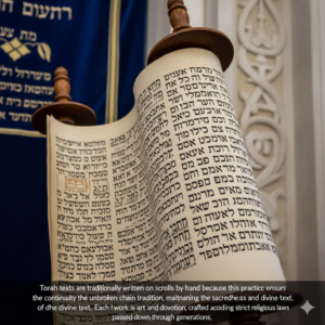 A imagem mostra um rolo da Torá, usado no Judaísmo. Por que o texto é escrito em rolos e muitas vezes à mão?