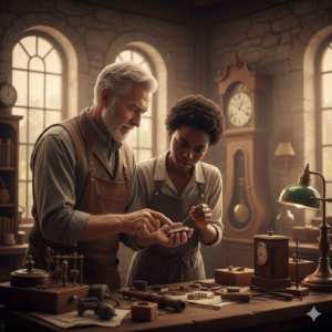 A cena descreve a transmissão de conhecimento. Qual o papel do ambiente e da figura do idoso nesta imagem?